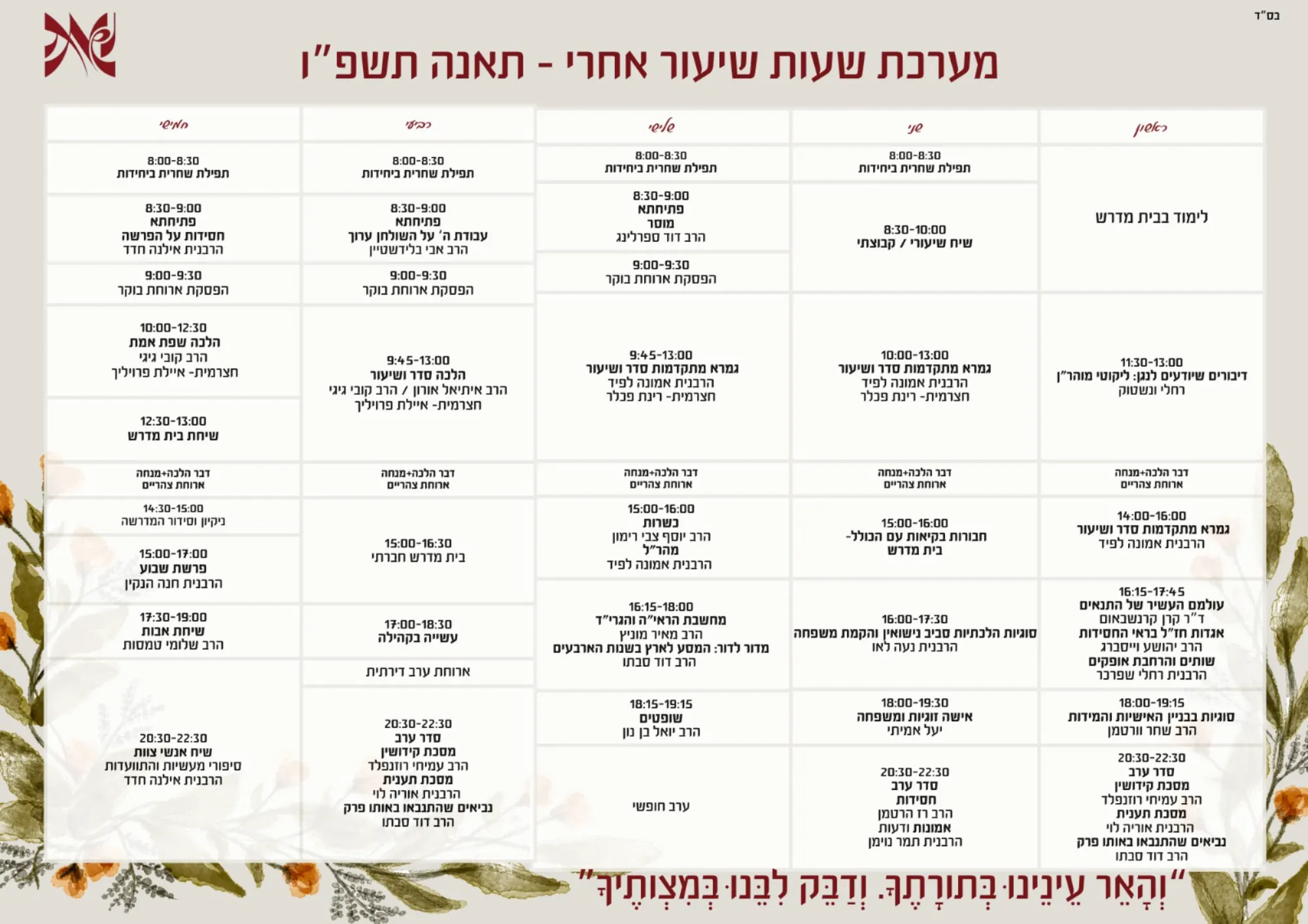 סדר היום הוא חמישה ימי לימוד מלאים מבוקר עד ערב- סדרי בוקר בגמרא והלכה. אל תדאגי גם אם לא למדת גמרא את לגמרי תרגישי בנח, רוב התלמידיות מגיעות ללא רקע ולומדות תוך כדי בליווי והנחיה של הר"מים. אחה"צ שיעורי בחירה מגוונים בנושאי חסידות, תנ"ך, מחשבה, זוגיות ועוד. בערב סדרי ערב לבחירה בתנך חסידות או גמרא. אחת לשבוע נפגשות לשיח שיעורי, זמן קבוצתי אינטימי ומחבר כל שבוע בהובלה של תלמידה אחרת. בימי רביעי אחה"צ מוקדשים לבית מדרש חברתי שעוסק בסוגיות בין ההלכה למציאות ולאחר מכן יוצאים להתנדבות ברחבי השכונה.